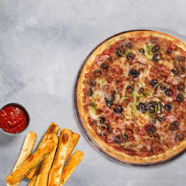 Stór eða pönnupizza af matseðli, 2 lítra ískalt gos, stór skammtur af brauðstöngum og sósa.